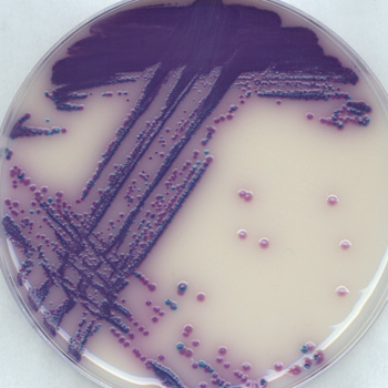Following enrichment, the sample is plated and chromogens within the medium enable differentiation of Salmonella colonies (bright purple) from any remaining organisms that are able to grow, such as Klebsiella (blue colonies) and Enterobacter (clear colonies to no growth), thus reducing the number of false-positives requiring confirmation.