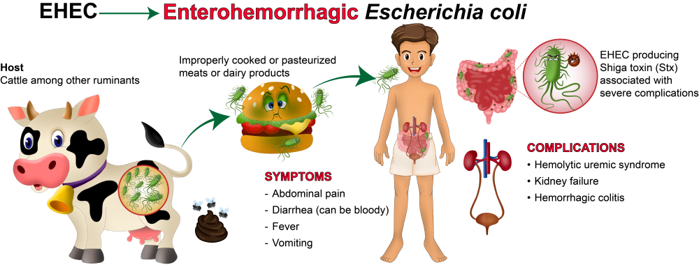 Ingestion of enterohemorrhagic Escherichia coli O157:H7 (EHEC) bacteria can occur after eating contaminated food, such as hamburger meat that has not been properly cooked. EHEC has also been responsible for outbreaks associated with contaminated food or vegetables. Consumption of contaminated food can cause infected people to have different symptoms. EHEC-associated infections often begin with bloody diarrhea, but can lead to much more dangerous outcomes like kidney failure and death via hemolytic uremic syndrome (HUS).
