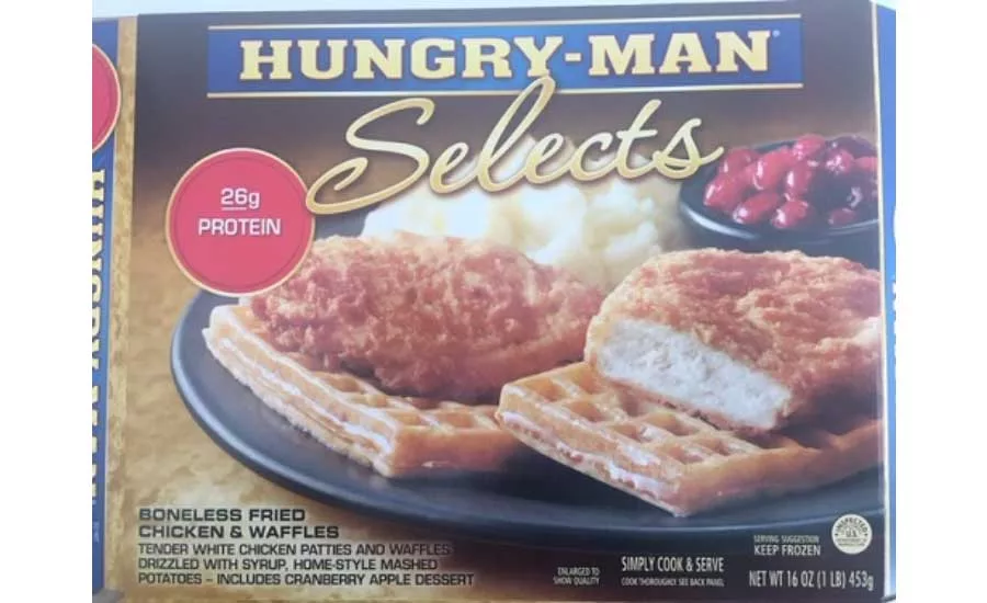 - 16-oz. individual frozen microwavable dinners containing a waffle and a fried chicken piece with “HUNGRY-MAN Selects BONELESS FRIED CHICKEN & WAFFLES” printed on the label and bearing UPC code 658276202903.