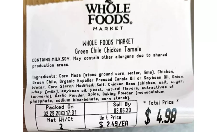 The affected products were sold at Whole Foods Market stores in Alabama, Arizona, California, Colorado, Georgia, Hawaii, Idaho, Illinois, Indiana, Iowa, Kansas, Michigan, Minnesota, Mississippi, Missouri, Nebraska, Nevada, New Mexico, North Carolina, South Carolina, Tennessee, Texas, Utah and Wisconsin. The tamales were sold in plastic containers and in family-style meal kits with Whole Foods Market scale labels. They were also available on the self-serve hot bar and from the chef’s case. The affected products can be identified by the following information. No allergic reactions have been reported to date.