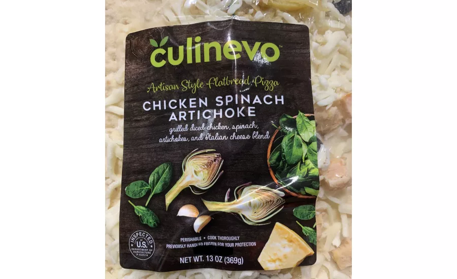 - 13-oz. plastic-wrapped cardboard trays containing “culinevo Artisan Style Flatbread Pizza CHICKEN SPINACH ARTICHOKE”.