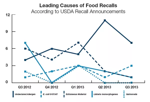• Foodborne illness remains a top concern, as Salmonella, Listeria and botulism accounted for more than 40 percent of recalls reported during the third quarter.