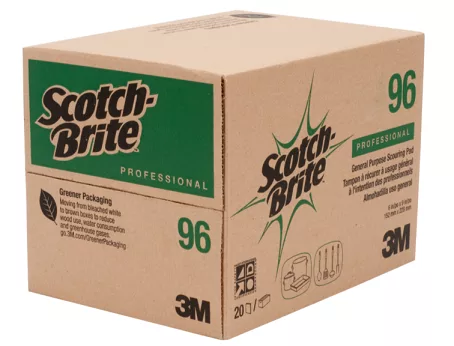 3M’s Commercial Solutions Division recently announced it will soon cease using mottle white and bleached corrugated boxes for several products in the Scotch-Brite commercial line. The market-leading products — including Scotch-Brite Hand Pads and Griddle Cleaning products — will soon be packaged in greener Kraft brown boxes. The change began during the past month and will be phased in as white packaging inventories are depleted. 3M is making the switch to greener packaging because the manufacturing process for Kraft brown boxes requires less wood and water, and emits fewer greenhouse gases than bleached or mottle white corrugated cartons, according to Mike Laatsch, U.S. sales and marketing director for 3M Commercial Solutions. The manufacturing of Kraft brown boxes also emits fewer harmful organic compounds that result in dioxin, a known carcinogen, being released into the environment. 3M estimates the annual environmental benefits of converting its shipping boxes from white to Kraft brown equate to: 1) 172 tons of wood saved, 2) 915,000 gallons of water saved, and 3) 113,000 lbs. less CO2 emitted.