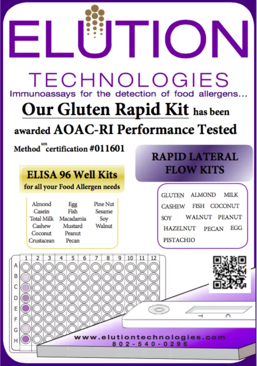 Elution Technologies, a manufacturer of food allergen kits, is proud to announce that their LFD Gluten Rapid Kit, GLTN-1005, has been awarded AOAC-RI Performance Tested Method certification (#011601). This method can detect gluten from rye, barley and wheat down to 5ppm in as little as five minutes in finished products with minimal prep. Simply dilute and test. Also, there is no cross-reactivity with oat, teas, millets or other grains or food commodities have been detected. As always, stainless steel surface and clean-in-place testing is applicable as well.