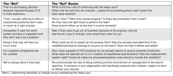Present a measurable goal to be attained, as well as the necessary level of resource commitment for its achievement. Decide on a timeline for completion, and then present a well-developed strategy that utilizes the appropriate resources and clearly correlates to the final objective. Improvement projects that lack the above elements (i.e., that aren’t focused) can be defined as “zombie projects”: they never live and flourish, they never seem to die or fade away, and the project teams simply take up space while consuming resources. Presenting a well-developed plan that enlists a member of marketing, operations, product development and purchasing to spend 15% of their time on a FIT whose clear goal is to reduce mislabeling complaints by 75% over the next three months is far more attractive than: “We have to get more resources to help us regain control over mislabeling, so can’t we free up a purchasing resource to help us deal with the vendor side?”