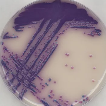 Following enrichment, the sample is plated onto chromogenic culture media. Chromogens within the medium enable differentiation of Salmonella colonies (bright purple) from any remaining organisms that are able to grow, such as Klebsiella (blue colonies) and Enterobacter (clear colonies to no growth), thus reducing the number of false positives that require confirmation.