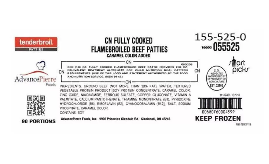 - 14.06-lb. cases containing three bags with 30 pieces for a total of 90 portions of “CN FULLY COOKED FLAMEBROILED BEEF PATTIES CARAMEL COLOR ADDED” with case code 155-525-0 and package code 8334.