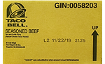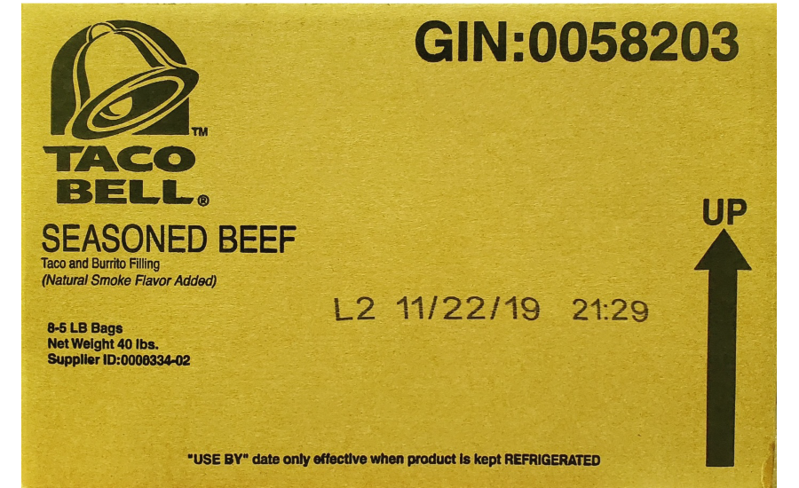 - Cases containing eight 5-lb. plastic bags of “TACO BELL SEASONED BEEF Taco and Burrito Filling” with use by dates of “L2 11/4/19” to “L2 11/18/19”.