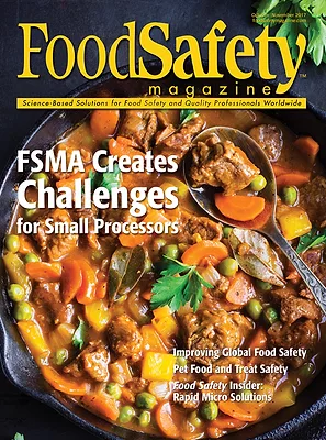 Explore the October/November 2017 edition of Food Safety Magazine, where we explore the challenges created for small processors by the FSMA, dealing with major system disruptions in meat processing facilities, FDA's regulation of color additives, and much more!
